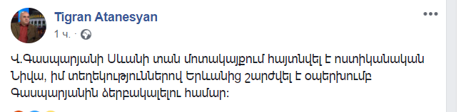 «Վլադիմիր Գասպարյանի Սևանի տան մոտակայքում հայտնվել է ոստիկանական Նիվա, իմ տեղեկություններով Երևանից շարժվել է օպերխումբ Գասպարյանին ձերբակալելու համար»,- գրել է նա ֆեյսբուքյան իր էջում: