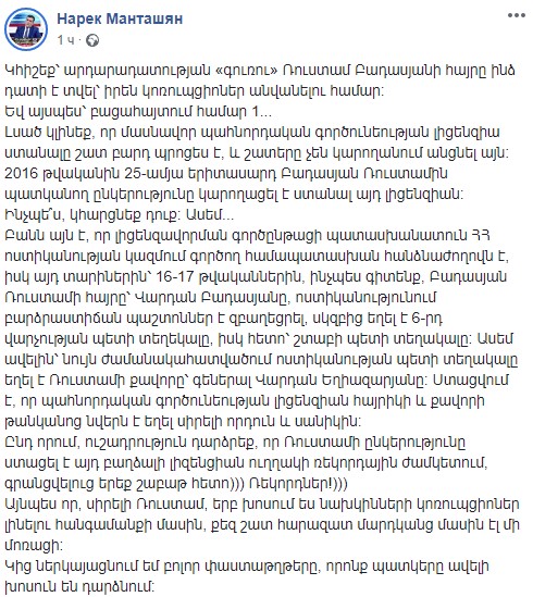 «Այլընտրանք» ՀԿ համահիմնադիր Նարեկ Մանթաշյանը ֆեյսբուքյան իր էջում գրել է. «Կհիշեք՝ արդարադատության «գուռու» Ռուստամ Բադասյանի հայրն ինձ դատի է տվել՝ իրեն կոռուպցիոներ անվանելու համար:
