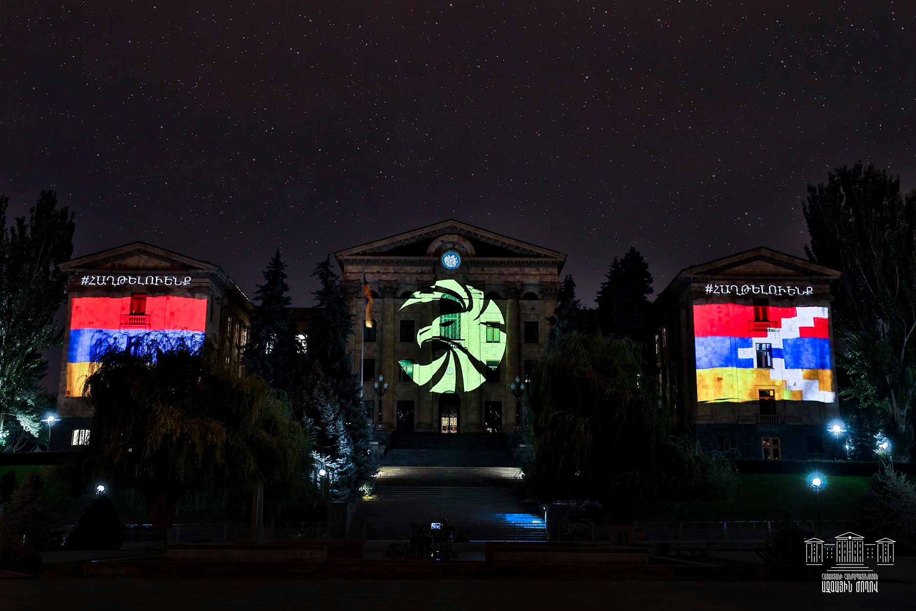 ԱԺ շենքը լուսավորվել է Հայաստանի և Արցախի դրոշներով, ինչպես նաև հայկական զինված ուժերի խորհրդանիշ արծվի նկարով