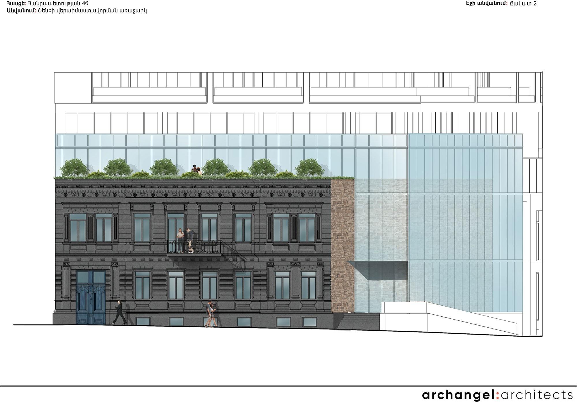 Հանրապետության 46 հասցեն քանդման գոտում գտնվող միակ շենքն է: Նախարարության տրամադրած էսքիզային նախագծի համաձայն` այն վերականգնելուց հետո ունենալու է հետևյալ տեսքը:
