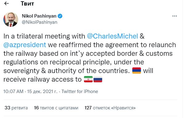 «Շառլ Միշելի և Ադրբեջանի նախագահի հետ եռակողմ հանդիպման ժամանակ մենք վերահաստատեցինք միջազգայնորեն ճանաչված սահմանին երկաթուղու գիծը վերագորարկելու և փոխադարձ սկզբունքով մաքսային կարգավորումների մասին համաձայնությունը՝ երկրների ինքնիշխանութան համաձայն: Հայաստանը երկաթուղային ճանապարհով հասանելիություն կստանա դեպի իրան և Ռուսաստան»,- գրել է Փաշինյանը: