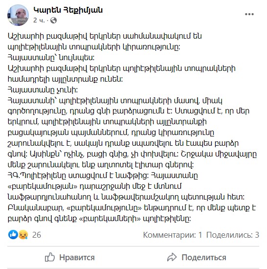 «Քաղաքացու իրավունքների պաշտպան» Կարեն Հեքիմյանի գրառումը. «Աշխարհի բազմաթիվ երկրներ սահմանափակում են պոլիէթիլենային տոպրակների կիրառությունը: