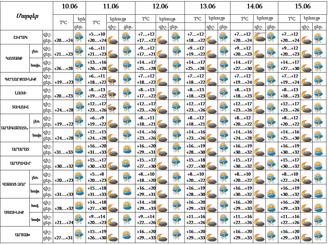 Հունիսի 10-ի երեկոյան ժամերին, 11-15-ի գիշերը և երեկոյան ժամերին սպասվում է կարճատև անձրև և ամպրոպ, ամպրոպի ժամանակ սպասվում է նաև քամու ուժգնացում՝ 18-20 մ/վ արագությամբ: