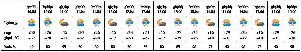 Հունիսի 10-ի կեսօրից հետո առանձին շրջաններում, 11-15-ի գիշերը և կեսօրից հետո շրջանների զգալի մասում սպասվում է կարճատև անձրև և ամպրոպ: Առանձին հատվածներում սպասվում է նաև կարկուտ: