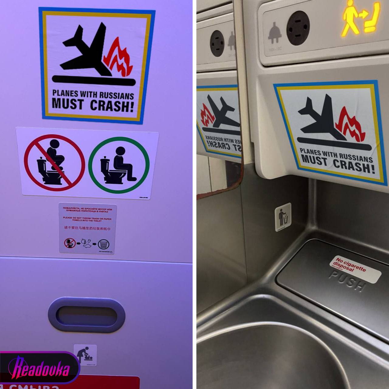 Սոցցանցերի օգտատերերը կադրեր են տարածում տարբեր միջազգային ընկերությունների ինքնաթիռներից: Օդանավի զուգարանի սենյակների աչքի ընկնող վայրերում փակցված են քաղաքական կպչուն պիտակներ՝ հակառուսական կոչերով։ Դրանց վրա, մասնավորապես, գրված է՝ ռուսներին տեղափոխող ինքնաթիռները պետք է կործանվեն («Planes with Russians must crash»):