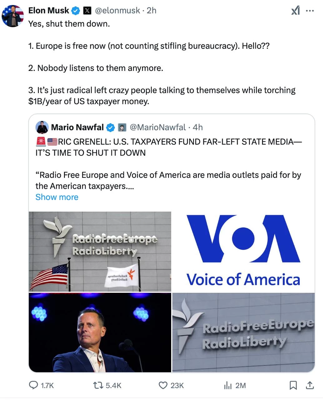 «Այո, փակեք դրանք։ Եվրոպան այժմ ազատ է (բացառությամբ խեղդող բյուրոկրատիայի): Նրանց այլևս ոչ ոք չի լսում։ Սրանք պարզապես արմատական ձախակողմյան խելագարներ են, ովքեր խոսում են իրենց հետ՝ այրելով տարեկան 1 միլիարդ դոլար ամերիկյան հարկային դոլարներ»: