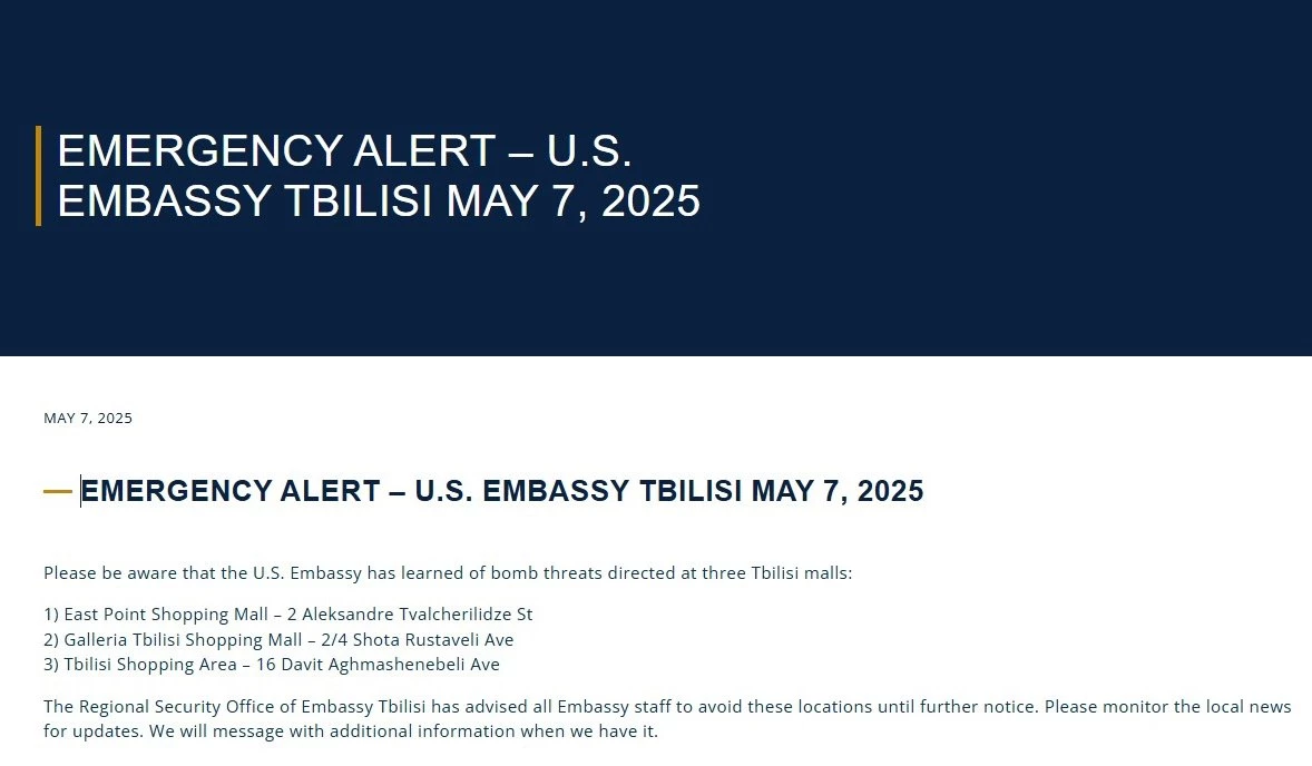 Վրաստանում ԱՄՆ դեսպանատունը նախազգուշացրել է իր քաղաքացիներին՝ տեղեկացնելով Թբիլիսիի առևտրի կենտրոններում պայթյունների սպառնալիքի մասին: