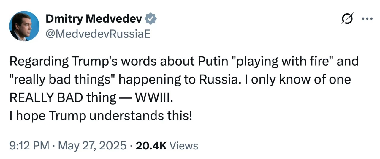 «Ես գիտեմ միայն մեկ իսկապես վատ բան՝ դա երրորդ համաշխարհային բանն է։ Հուսով եմ՝ Թրամփը դա հասկանում է»,- գրել է նա X սոցիալական ցանց էջում: