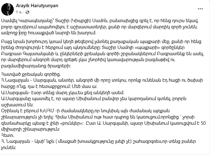«Բայց նրան խորհուրդ կտամ կեղծ թեզերով չմտնել քաղաքական պայքարի մեջ, քանի որ հենց իրենց ժողովուրդն է հերքում այդ պնդումները: Տաշիր Սամոյի «պայքարի» գործընկեր Բագրատ Գալստանյանի և ընկերների քրեական գործի շրջանակներում Բագրատենք են ասել, որ մարզերում անգործ մարդ գրեթե չկա շնորհիվ կառավարության բազմաթիվ ու բազմամիլիարդանոց ծրագրերի: