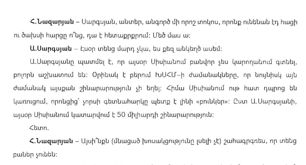 Օրինակ է բերում ԽՍՀՄ-ի ժամանակները,որ նույնիսկ այն ժամանակ այդքան շինարարություն չի եղել: Հիմա Սիսիանում ութ հատ դպրոց են կառուցում,որոնցից ` չորսի գետնահարկը պետք է լինի «բունկեր»: Ըստ Ա. Սարգսյանի, այսօր Սիսիանում կառուցվում է 50 միլիարդի շինարարություն: