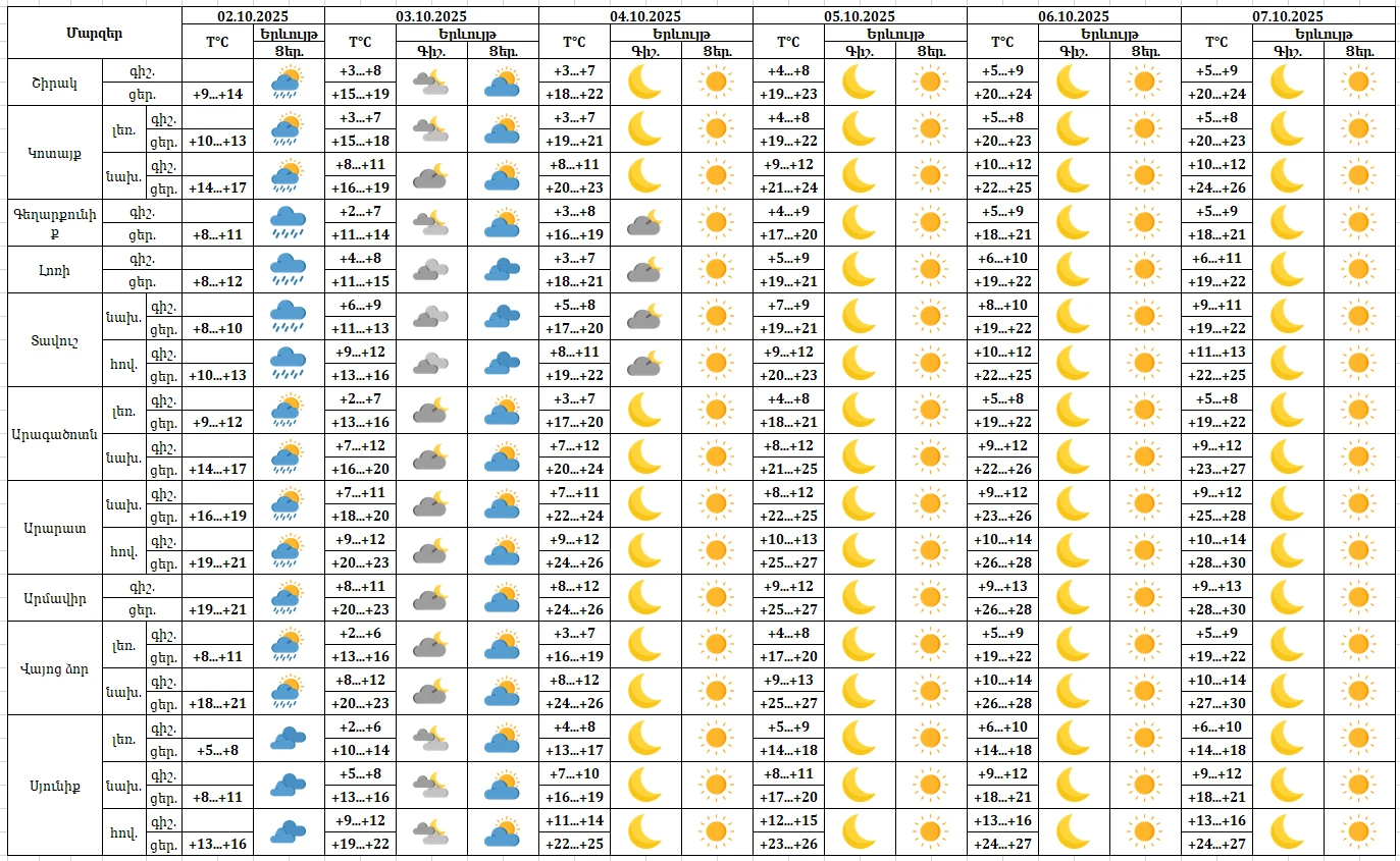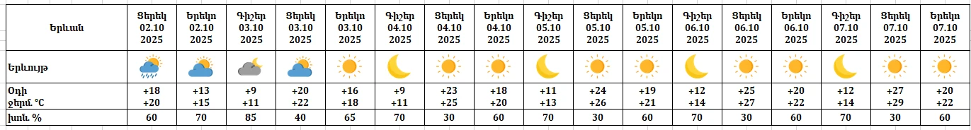 Հոկտեմբերի 3-7-ին սպասվում է առանց տեղումների եղանակ։ Քամին՝ արևմտյան՝ 2-5մ/վ։ Օդի ջերմաստիճանը հոկտեմբերի 3-7-ին աստիճանաբար կբարձրանա 8-10 աստիճանով։