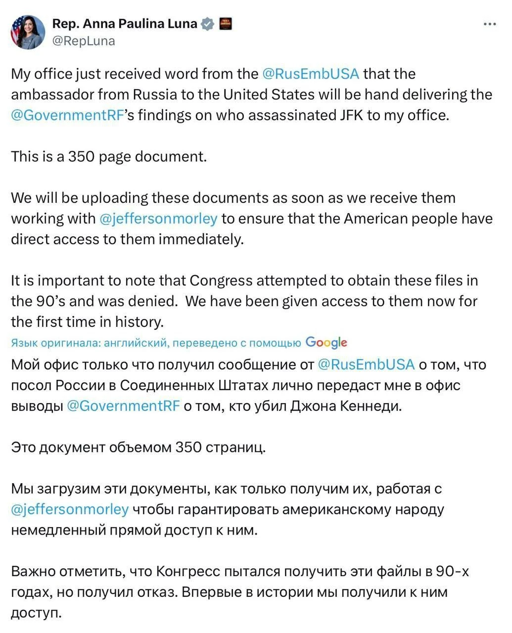 Վաշինգտոնում ՌԴ դեսպան Ալեքսանդր Դարչիևը կոնգրեսական Աննա Պաուլինա Լունային է փոխանցել 350 էջանոց զեկույց խորհրդային արխիվներից՝ նվիրված 1963 թվականի իրադարձություններին: