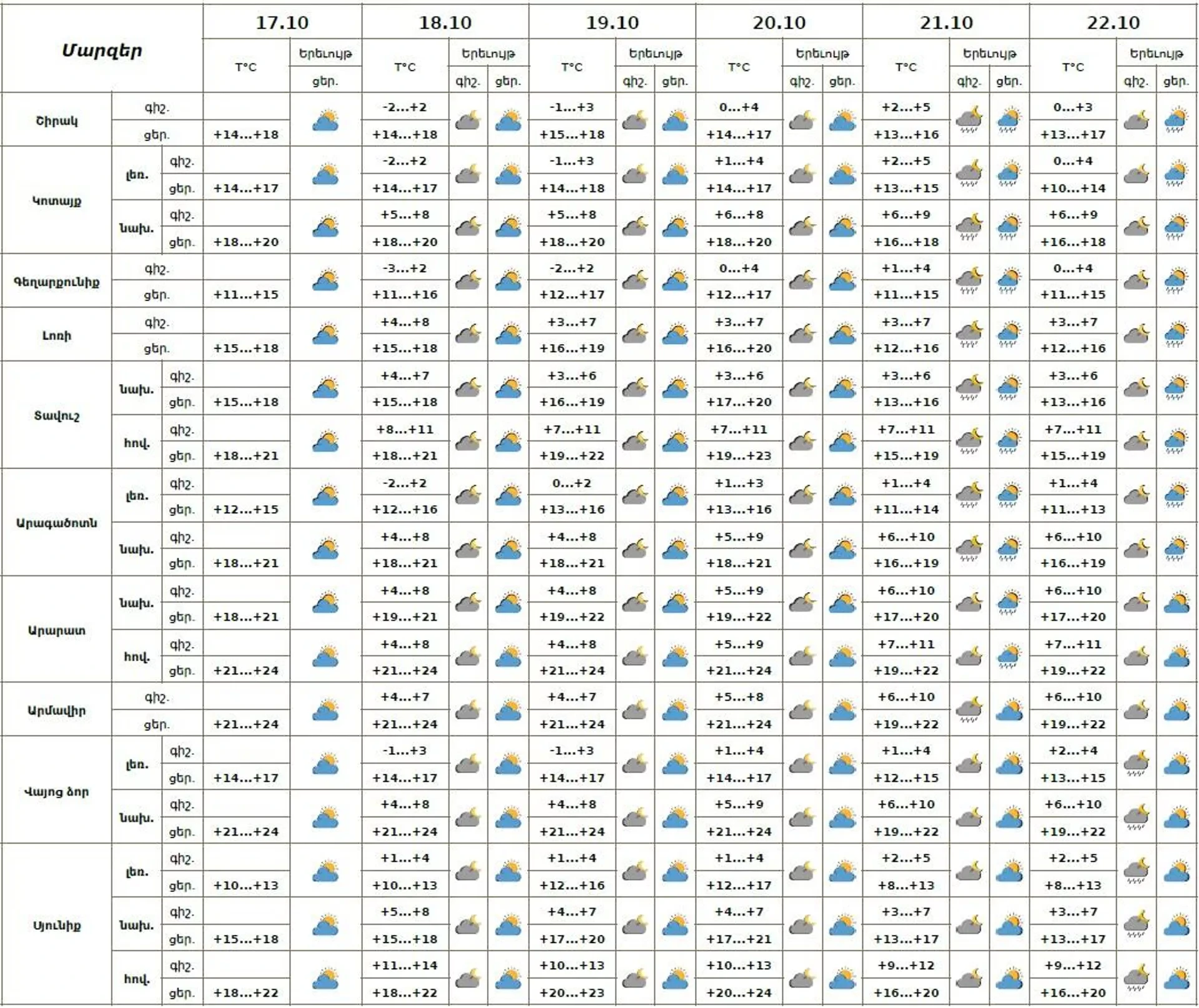 Հաղորդագրության համաձայն` քամին կլինի արևմտյան՝ 2-5մ/վ աագությամբ: Օդի ջերմաստիճանը հոկտեմբերի 20-21-ին գիշերը կբարձրանա 4-5 աստիճանով։