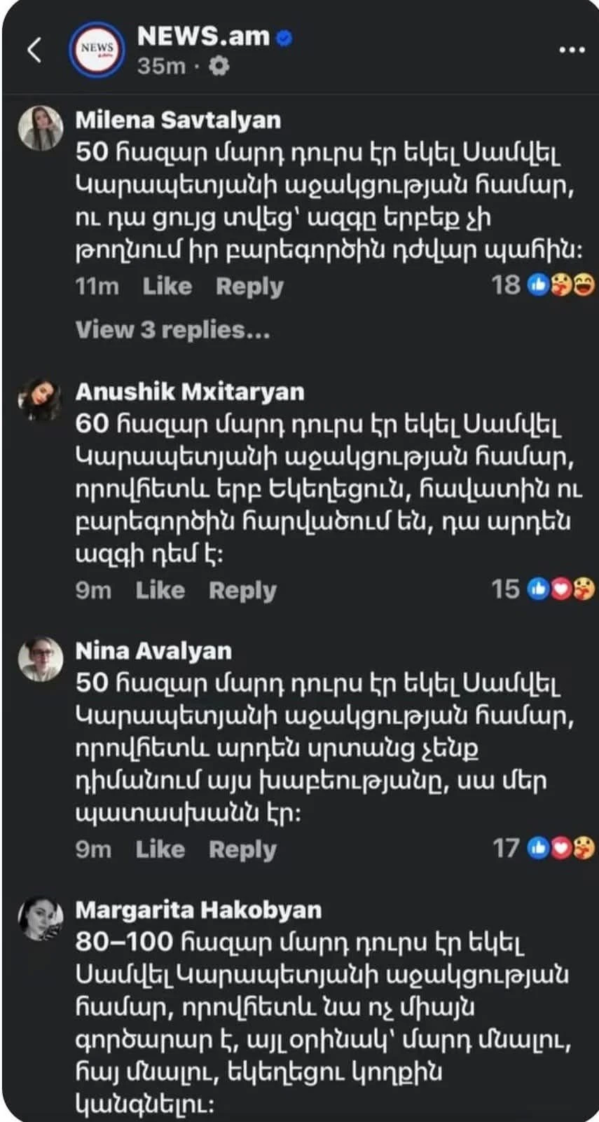 «Բոլոր թվերն էլ բացարձակ ճշմարՏՈՒՏՈՒթյուն են` հաշվարկված միևնույն կենտրոնում, պարզապես հաշվելու տարբեր մեթոդներ են կիրառվել` արդյունավեՏՈՒՏՈՒթյան համար»,- գրել է Պարսիլյանը՝ ակնարկելով շարժման հանրահավաքի պաստառների վրա եղած տառասխալով գրությունը: