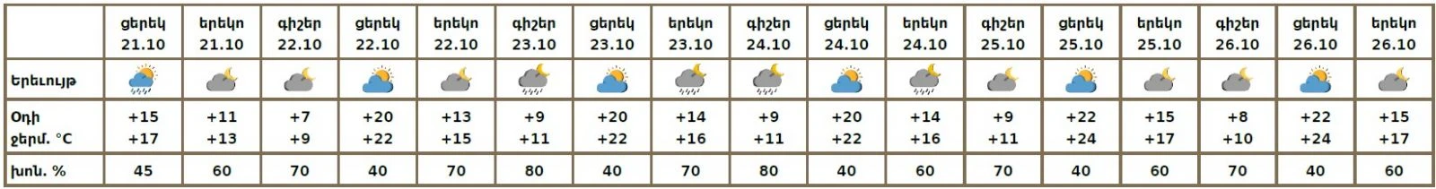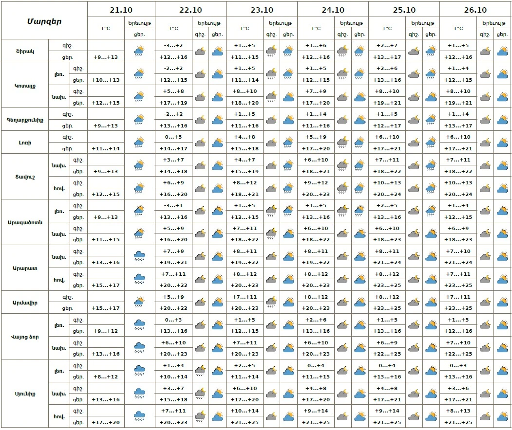 Օդի ջերմաստիճանը հոկտեմբերի 21-ի ցերեկը կնվազի 3-4 աստիճանով, հոկտեմբերի 22-ի ցերեկը նույնքան կբարձրանա։