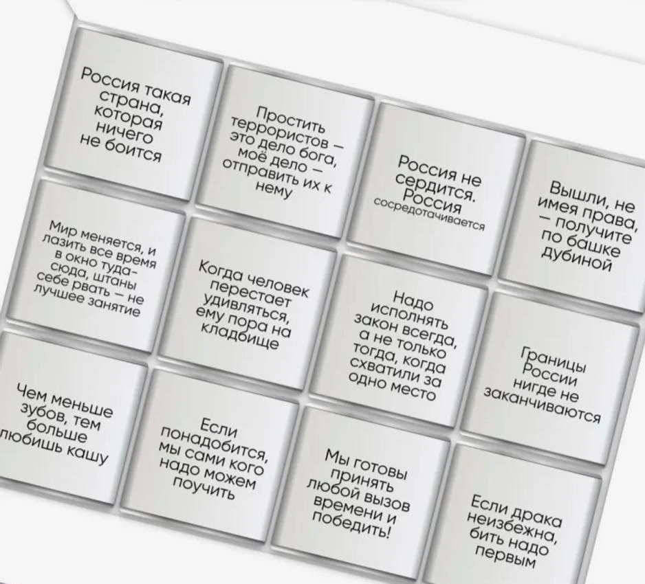 Կից լուսանկարում պատկերված են շոկոլադե սալիկներ՝ Ռուսաստանի նախագահի մեջբերումներով։