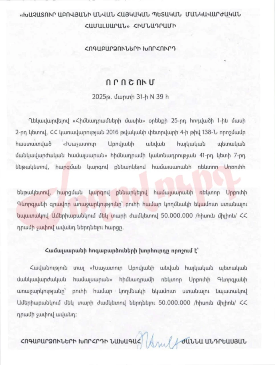 Ըստ պաշտոնական փաստաթղթերի, որոնք օրաթերթի ձեռքում են հայտնվել, ՀՊՄՀ հոգաբարձուների խորհուրդը 2025 թվականի մարտի 31-ին ընդունել է թիվ 39 որոշումը, որով ռեկտորի գրավոր առաջարկությամբ հավանություն է տրվել բուհի համար «կողմնակի եկամուտ» ստանալու նպատակով 50 միլիոն ՀՀ դրամի չափով ավանդի ներդրմանը Հայաստանի բանկերից մեկում մեկ տարի ժամկետով։