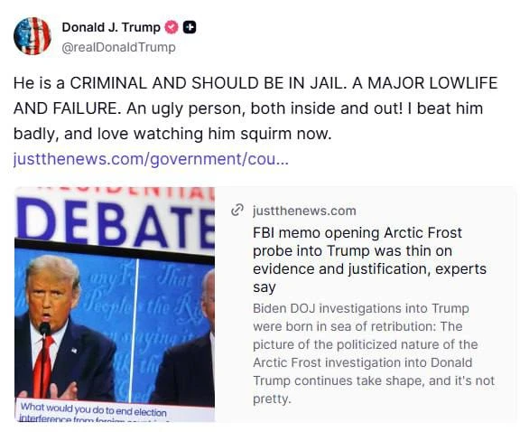 «Նա հանցագործ է և պետք է նստի բանտում։ ԽՈՇՈՐ ՊԱՐՏՎՈՂ և ՍՏՈՐ ՄԱՐԴ: Տգեղ մարդ ինչպես ներսից, այնպես էլ դրսից», - գրել է ԱՄՆ նախագահը։
