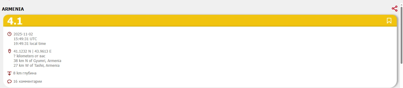 Նոյեմբերի 2-ին` տեղական ժամանակով ժամը 19:49-ին (Գրինվիչի ժամանակով` ժամը 15։49-ին) ՀՀ ՆԳՆ Սեյսմիկ պաշտպանության տարածքային ծառայության սեյսմոլոգիական ցանցի կողմից գրանցվել է հյուսիսային լայնության 41․08⁰ և արևելյան երկայնության 43.89⁰ աշխարհագրական կոորդինատներով Հայաստան-Վրաստան սահմանային գոտի՝ Բավրա գյուղից 8 կմ հարավ-արևելք, օջախի 10 կմ խորությամբ 4.1 մագնիտուդով երկրաշարժ: