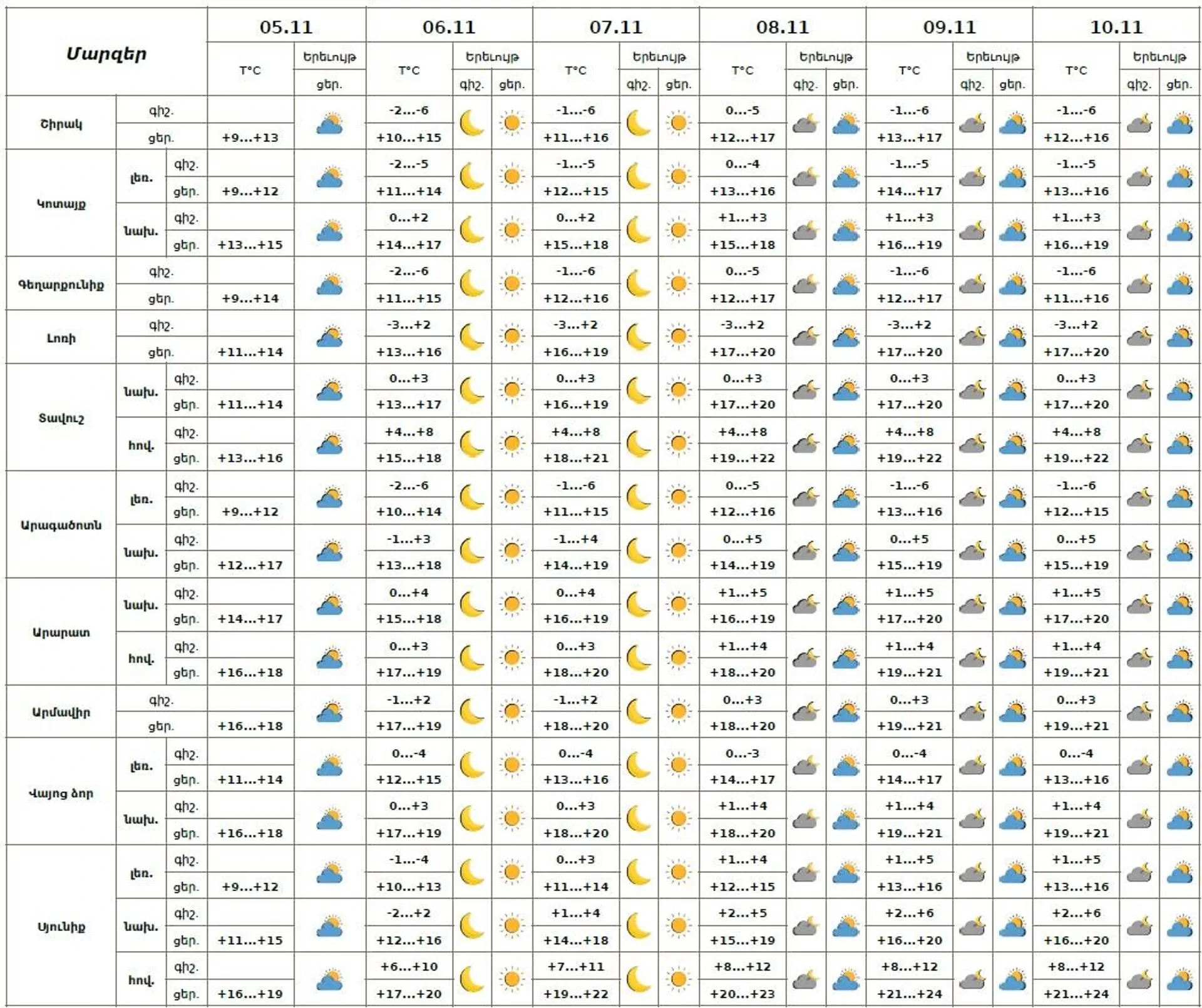 Կենտրոնի տվյալներով՝ նոյեմբերի 6-9-ը հանրապետության տարածքում օդի ջերմաստիճանը աստիճանաբար կբարձրանա 4-6 աստիճանով։ Նշված օրերին տեղումներ չեն կանխատեսվում։