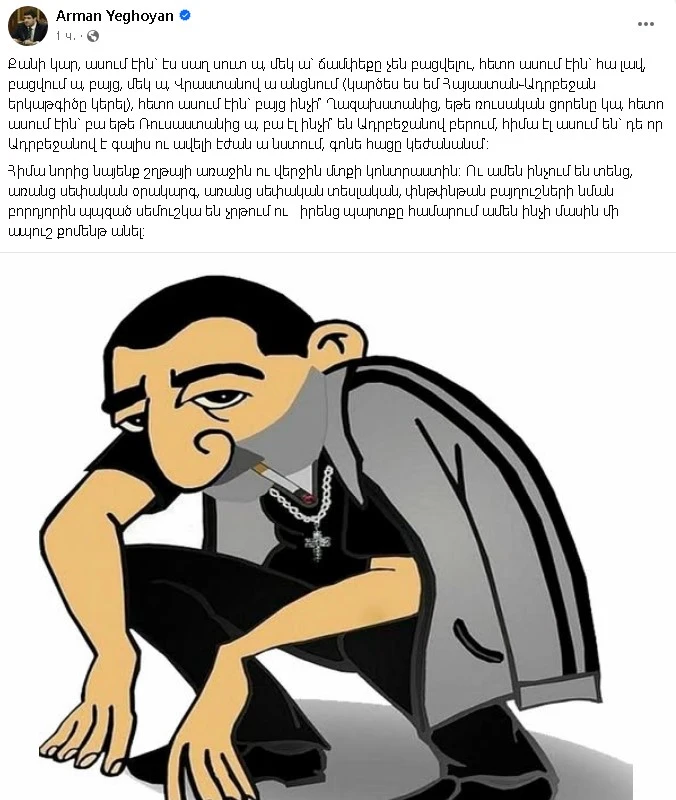 Քանի կար, ասում էին` էս սաղ սուտ ա, մեկ ա` ճամփեքը չեն բացվելու, հետո ասում էին` հա լավ, բացվում ա, բայց, մեկ ա, Վրաստանով ա անցնում (կարծես ես եմ Հայաստան-Ադրբեջան երկաթգիծը կերել), հետո ասում էին` բայց ինչի՞ Ղազախստանից, եթե ռուսական ցորենը կա, հետո ասում էին` բա եթե Ռուսաստանից ա, բա էլ ինչի՞ են Ադրբեջանով բերում, հիմա էլ ասում են` դե որ Ադրբեջանով է գալիս ու ավելի էժան ա նստում, գոնե հացը կեժանանա՞։ Այս մասին գրել է ԱԺ ՔՊ խմբակցության պատգամավոր Արման Եղոյանը։