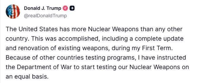 «Ամերիկայի միջուկային զինանոցը ամբողջությամբ արդիականացվեց իմ նախագահության ընթացքում։ Այժմ, երբ այլ երկրներ անցկացնում են իրենց փորձարկումները, ես հանձնարարել եմ Պաշտպանության նախարարությանը սկսել միջուկային փորձարկումներ՝ հավասար պայմաններում»,- ասել է Թրամփը։