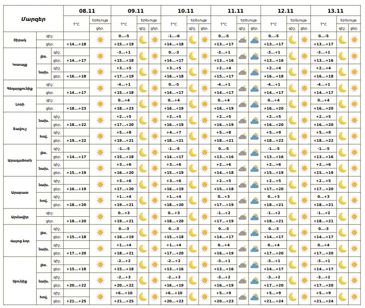 Երևանում նոյեմբերի 9-13-ը սպասվում է առանց տեղումների եղանակ։ Հանրապետության տարածքում նոյեմբերի 8-ի ցերեկը, ինչպես նաև 9-13-ը, կանխատեսվում է առանց տեղումների եղանակ։ Քամին կլինի հարավարևմտյան՝ 2-5 մ/վ արագությամբ։ Օդի ջերմաստիճանը նոյեմբերի 8-9-ի ցերեկը աստիճանաբար կբարձրանա 1-2 աստիճանով։