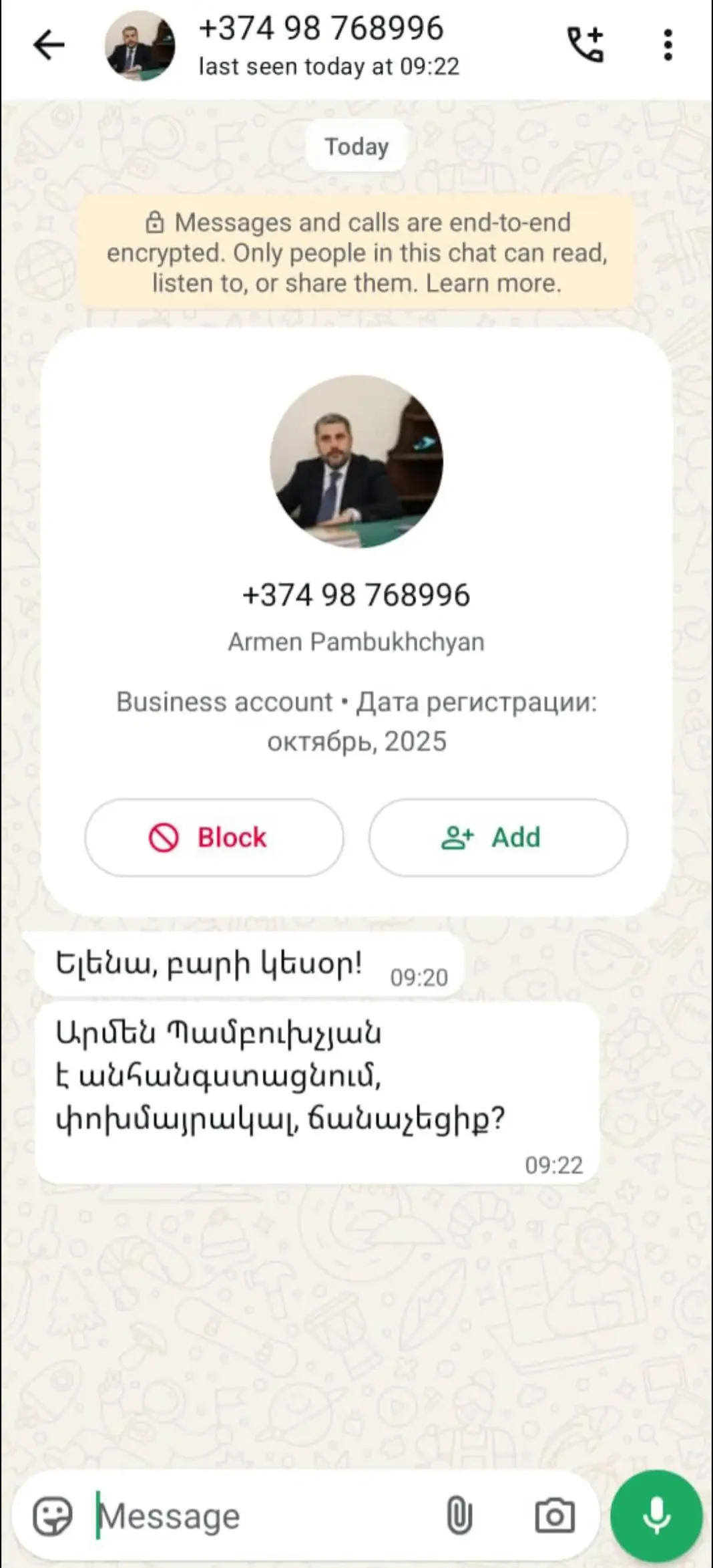 Արմեն Փամբուխչյանի անունով WhatsApp հաշիվ է բացվել