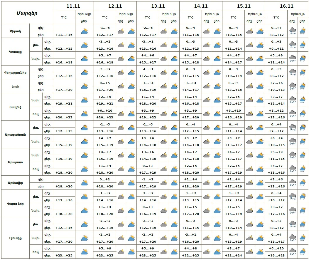 Երևանում նոյեմբերի 11-ի ցերեկը, 12-15-ը սպասվում է առանց տեղումների եղանակ։ Նոյեմբերի 16-ին սպասվում է անձրև։