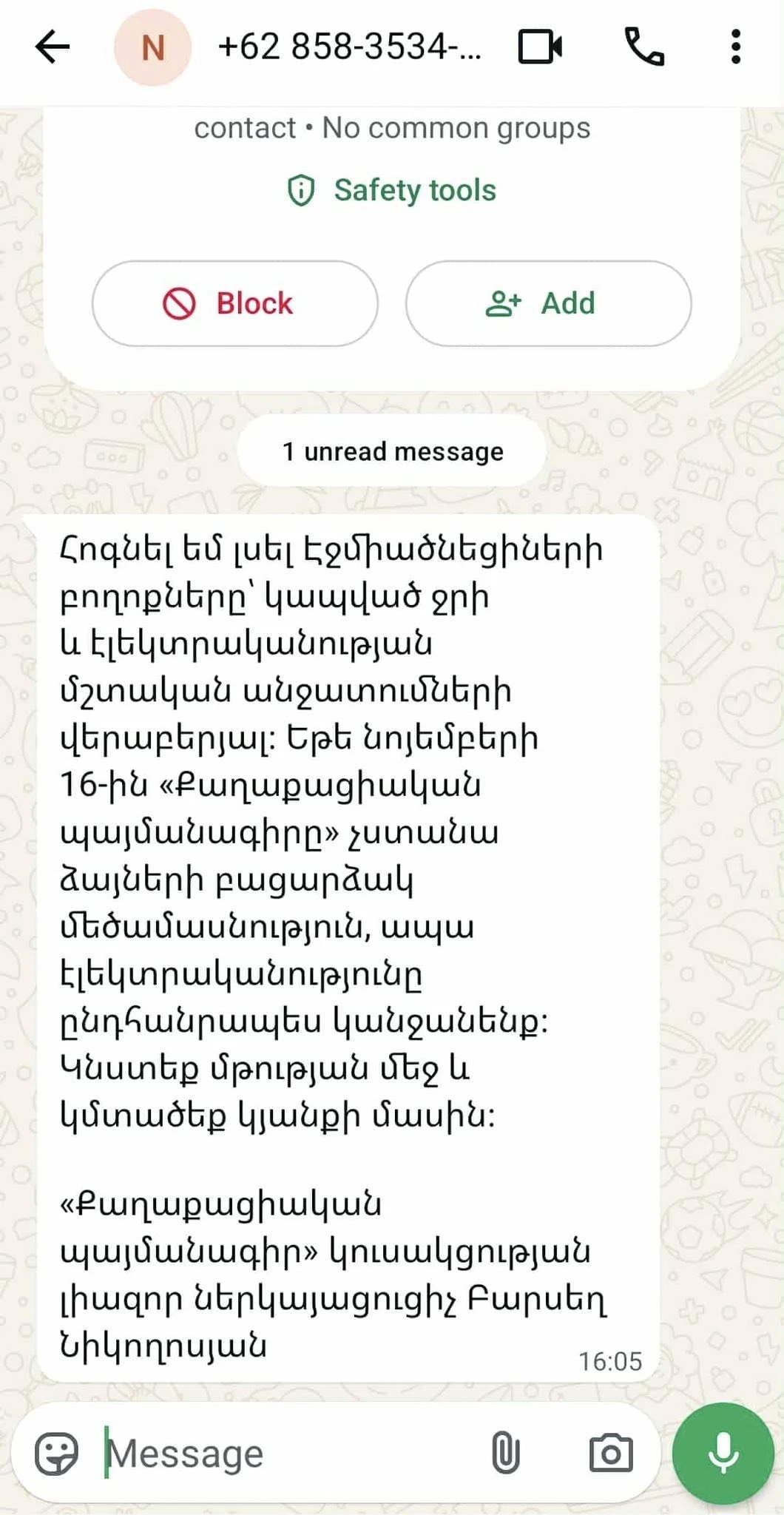 «Վերջին ժամերին բազմաթիվ քաղաքացիներ ստանում են կեղծ հաղորդագրություններ (կցում եմ պատկերները), որոնք ուղղված են նախընտրական շրջանում մթնոլորտը պղտորելուն, քաղաքացիներին մոլորեցնելուն։ Եթե նկատեցիք, ուղարկողի համարը հայաստանյան չէ, Ինդոնեզիայի կոդ է։ Մանրուք է, սակայն միշտ պետք է նման մանրուքներին ուշադրություն դարձնել, որպեսզի սադրանքը չհասնի իր արդյունքին։