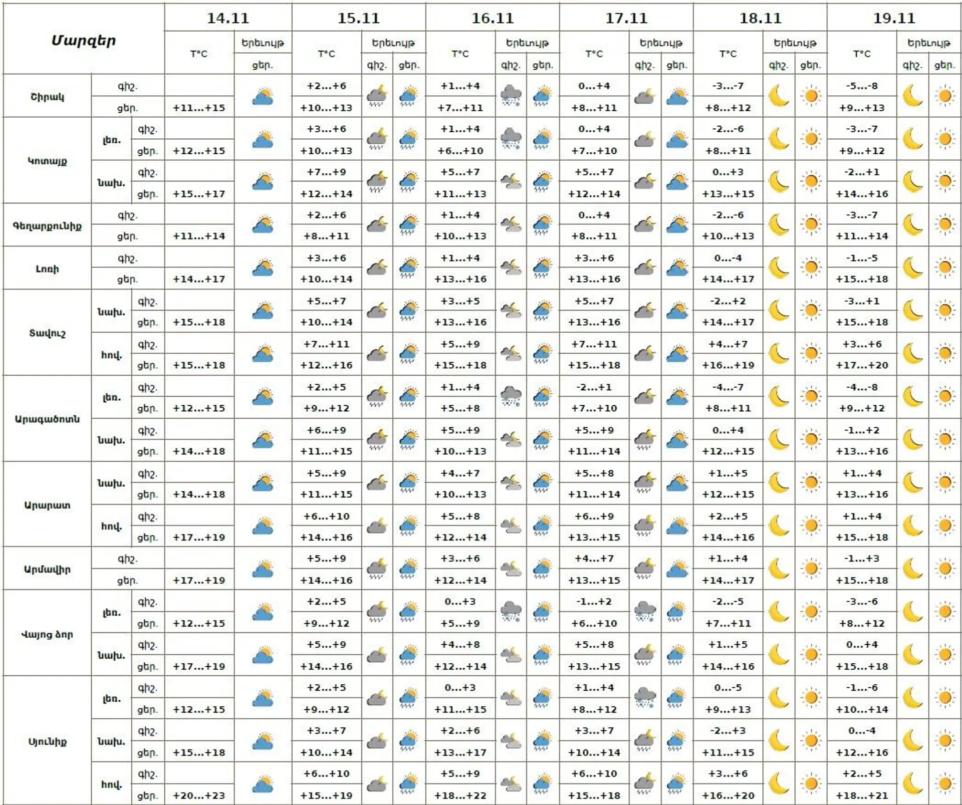 Օդի ջերմաստիճանը նոյեմբերի 15-16-ին ցերեկը կնվազի 3-5 աստիճանով, 17-19-ին աստիճանաբար նույնքան կբարձրանա։