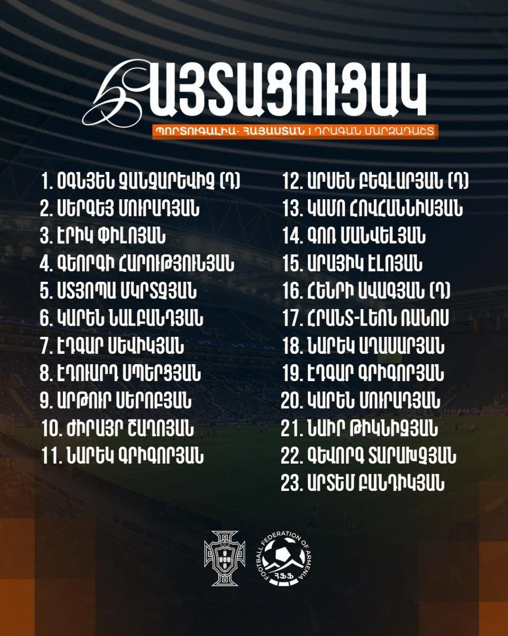 Հավելենք, որ Պորտուգալիա-Հայաստան հանդիպումից առաջ հրապարակվել է Հայաստանի հավաքականի հայտացուցակը: