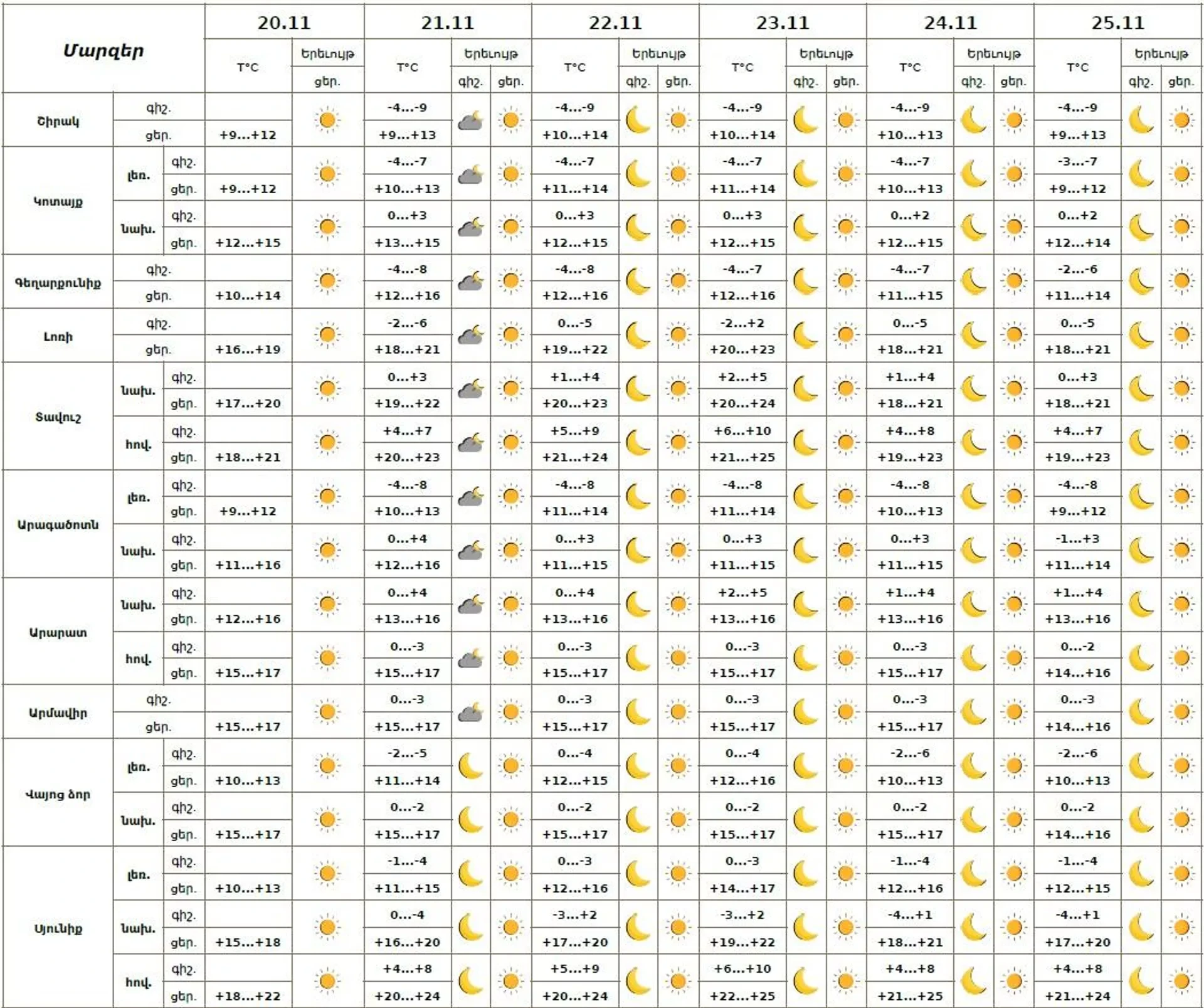 Օդի ջերմաստիճանը նոյեմբերի 20-23-ին ցերեկային ժամերին Լոռիում, Տավուշում և Սյունիքում աստիճանաբար կբարձրանա ևս 2-5 աստիճանով, մնացած շրջաններում Էապես չի փոխվի։
