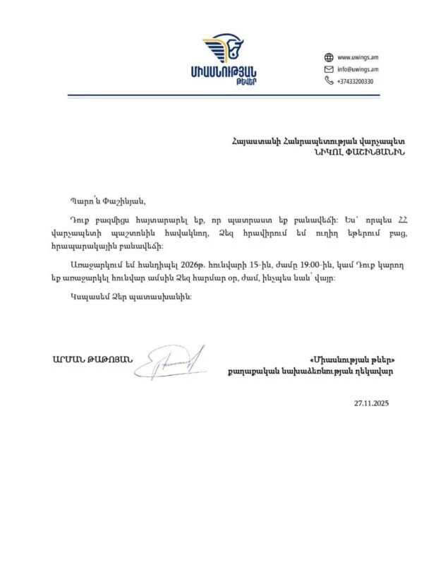 «Միասնության թևեր» քաղաքական նախաձեռնության ղեկավար Արման Թաթոյանը հայտնել է, որ հունվարի 15-ին, ժամը 19:00-ին, պաշտոնական նամակով հրավիրել է Նիկոլ Փաշինյանին ուղիղ եթերով բաց և հրապարակային բանավեճի։