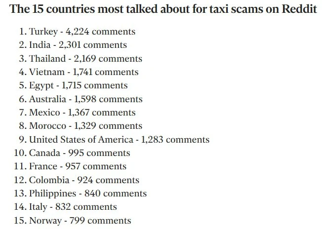 Աշխարհի տարբեր երկրներ այցելող ճանապարհորդները Reddit հարթակում ակտիվորեն կիսվել են դեպքերով, երբ տաքսիստները գործել են ոչ բարեխղճորեն։ Ինչպես գրում է The Independent-ը, ապահովագրական AllClear ընկերությունը վերլուծել է ավելի քան 450 հրապարակում և շուրջ 30 հազար մեկնաբանություն՝ կազմելով երկրների վարկանշային աղյուսակ, որտեղ նման դեպքերն առավել հաճախ են հանդիպում։