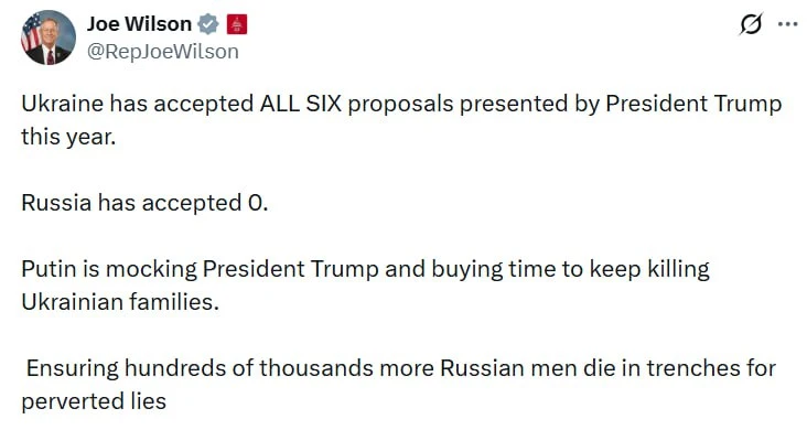 Ուկրաինան համաձայնել է բոլոր վեց առաջարկներին, որոնք այս տարի ներկայացրել է ԱՄՆ նախագահ Դոնալդ Թրամփը, մինչդեռ Ռուսաստանը չի աջակցել ոչ մեկին: Այս մասին հայտարարել է հանրապետական կոնգրեսական Ջո Ուիլսոնը: