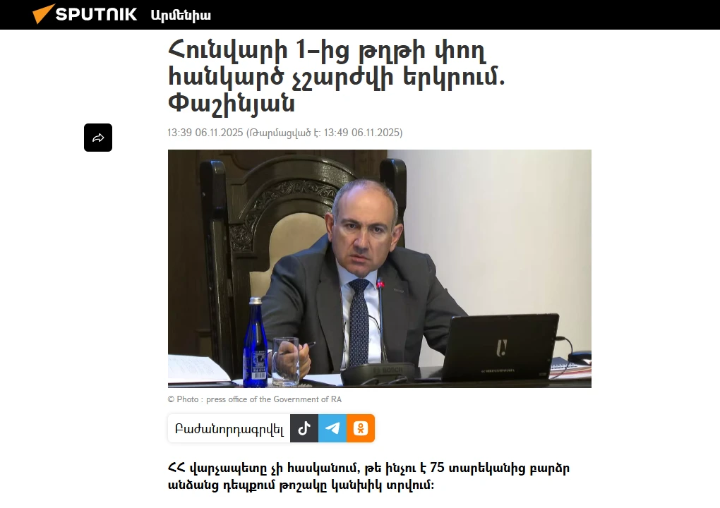 Գոյություն ունի կարևոր հանգամանք, որը միտումնավոր անտեսում է Հանձնաժողովը։ Վարչապետի հայտարարության նույնանման ձևակերպմամբ տեղեկատվությունն առաջինը տարածել են մի շարք լրատվամիջոցներ, այդ թվում՝ Ռուսաստանի կառավարության հովանու ներքո գործող «Արմենիա Սպուտնիկ» գործակալությունը։