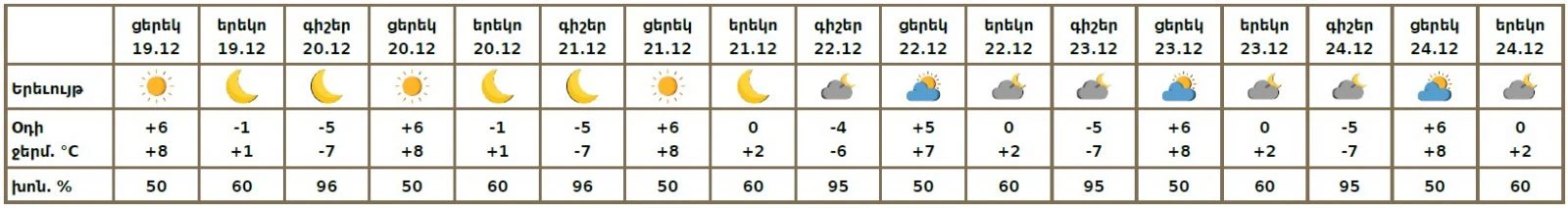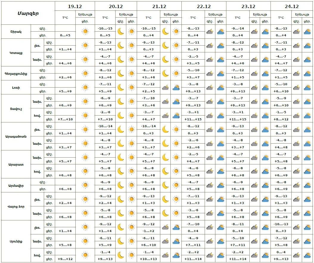 Դեկտեմբերի 20-24-ին սպասվում է առանց տեղումների եղանակ։ Քամին հյուսիսային՝ 2-5մ/վ, դեկտեմբերի 22-23- ին սպասվում է քամու ուժգնացում՝ 14-17 մ/վ արագությամբ։ Օդի ջերմաստիճանն էապես չի փոխվի։