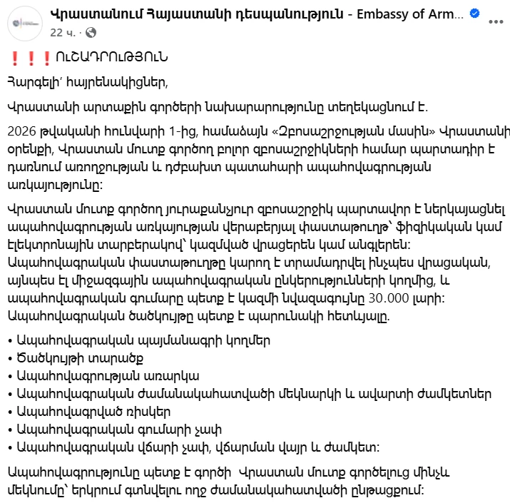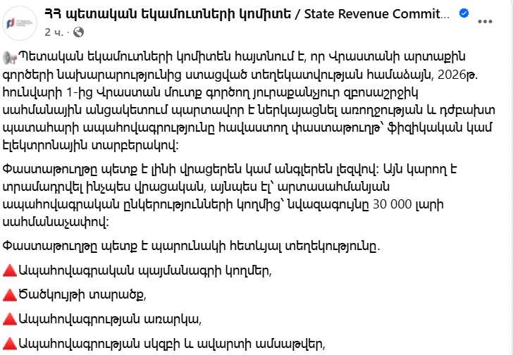Պետական եկամուտների կոմիտեն հայտնում է, որ Վրաստանի արտաքին գործերի նախարարությունից ստացված տեղեկատվության համաձայն, 2026թ. հունվարի 1-ից Վրաստան մուտք գործող յուրաքանչյուր զբոսաշրջիկ սահմանային անցակետում պարտավոր է ներկայացնել առողջության և դժբախտ պատահարի ապահովագրությունը հավաստող փաստաթուղթ՝ ֆիզիկական կամ էլեկտրոնային տարբերակով։