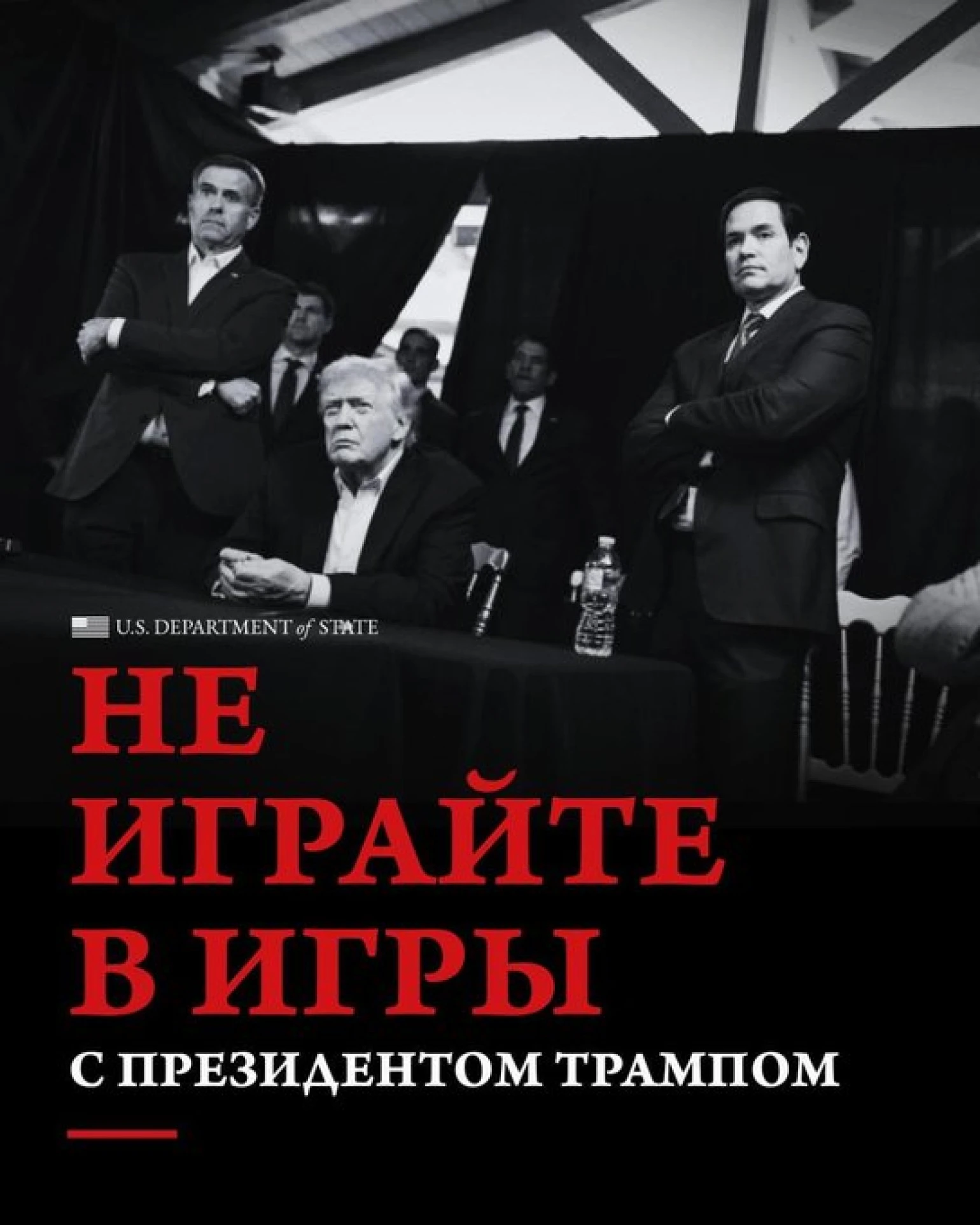 ԱՄՆ Պետդեպարտամենտը X սոցիալական ցանցի էջերում մի քանի լեզուներով, այդ թվում՝ ռուսերենով, հրապարակել է «Խաղեր մի՛ խաղացեք նախագահ Թրամփի հետ» հաղորդագրությունը։