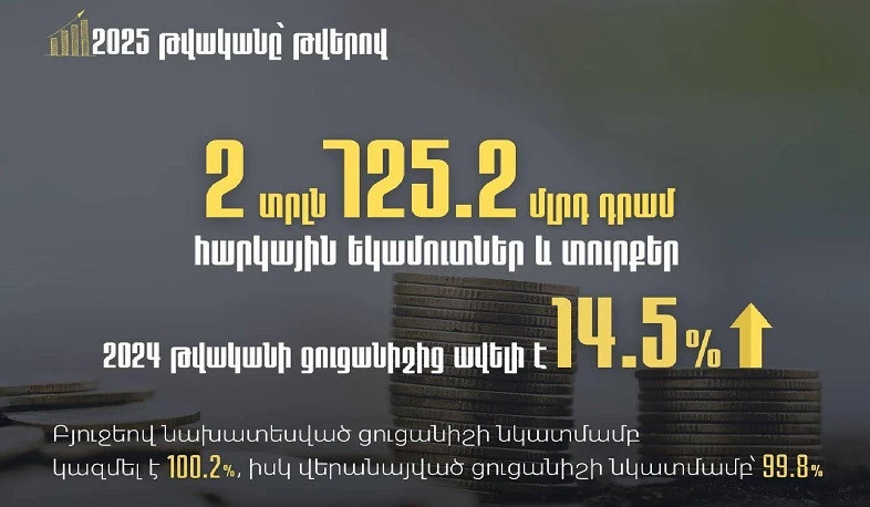 «Այսպես, 2025 թ. ընթացքում հարկ վճարողների հետ ապահովել ենք 2 տրլն 725.2 մլրդ դրամ հարկային եկամուտներ և պետական տուրքեր, ինչը 2024 թ. ցուցանիշից ավելի է 334.3 մլրդ դրամով կամ 14.5%-ով: