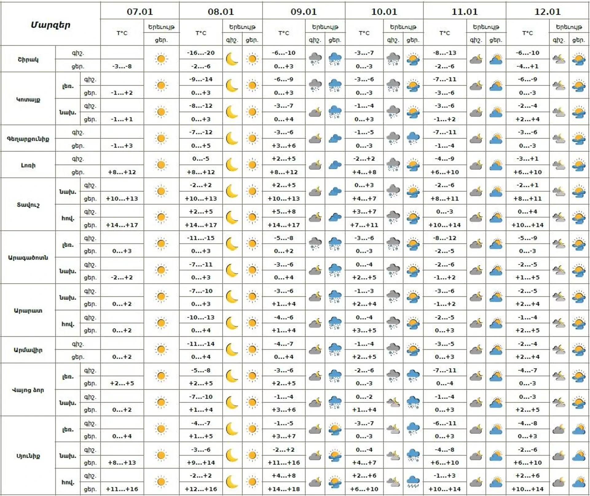 Օդի ջերմաստիճանը մինչև վաղը ցերեկը կբարձրանա 3-5, հունվարի 8-10-ի գիշերը՝ 14- 18 աստիճանով։