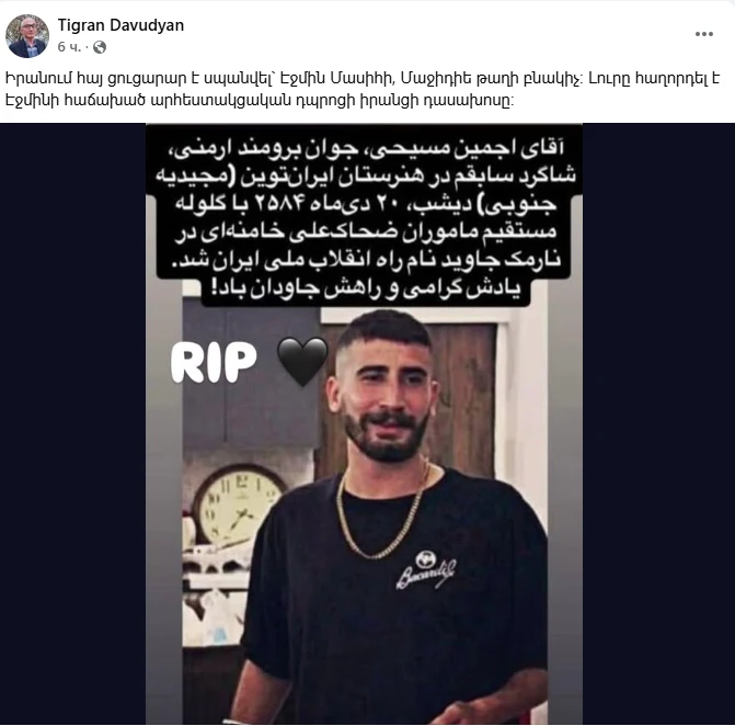 Իրանում հայ ցուցարար է սպանվել` Էջմին Մասիհի, Մաջիդիե թաղի բնակիչ։