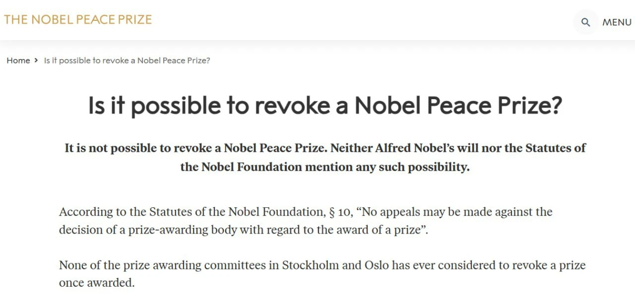 Նոբելյան կոմիտեն, սակայն, շեշտել է, որ նման քայլը իրավական և կանոնադրական առումով անհնար է՝ անկախ հայտարարությունների կամ քաղաքական զարգացումների բովանդակությունից։
