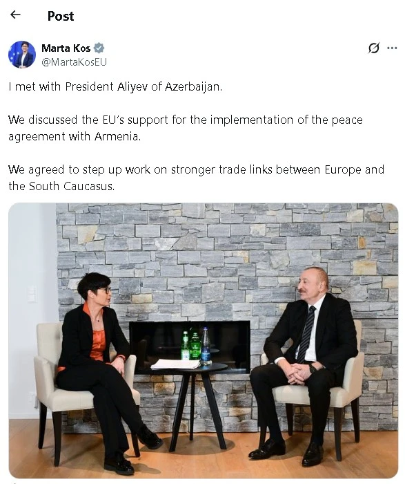 Ես հանդիպում եմ ունեցել Ադրբեջանի նախագահ Ալիևի հետ։ Այս մասին հայտնել է ընդլայնման հարցերով Եվրամիության հանձնակատար Մարտա Կոսը։