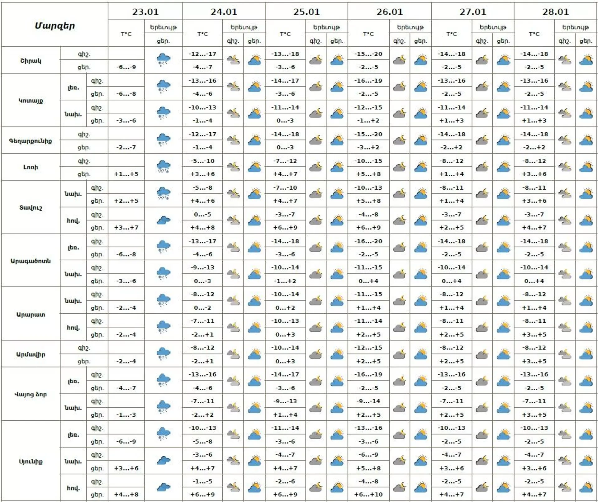 Ինչ վերաբերում է մայրաքաղաքին, ապա այսօր Երևանում ցերեկային ժամերին օդի ջերմաստիճանը կտատանվի 0–ից -2, իսկ գիշերը` -8-ից -10 աստիճանի սահմաններում։
