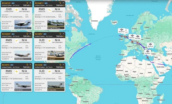 Flightradar24-ի և ADS-B Exchange-ի տվյալների համաձայն՝ ԱՄՆ ռազմաօդային ուժերի C-17A Globemaster III ռազմական տրանսպորտային ինքնաթիռները բեռներ են հասցնում Մերձավոր Արևելք՝ Տեխասի Ֆորտ Կավազոսում գտնվող բանակի հակաօդային պաշտպանության գնդի կողմից օգտագործվող Ռոբերտ Գրեյ օդանավակայանից։