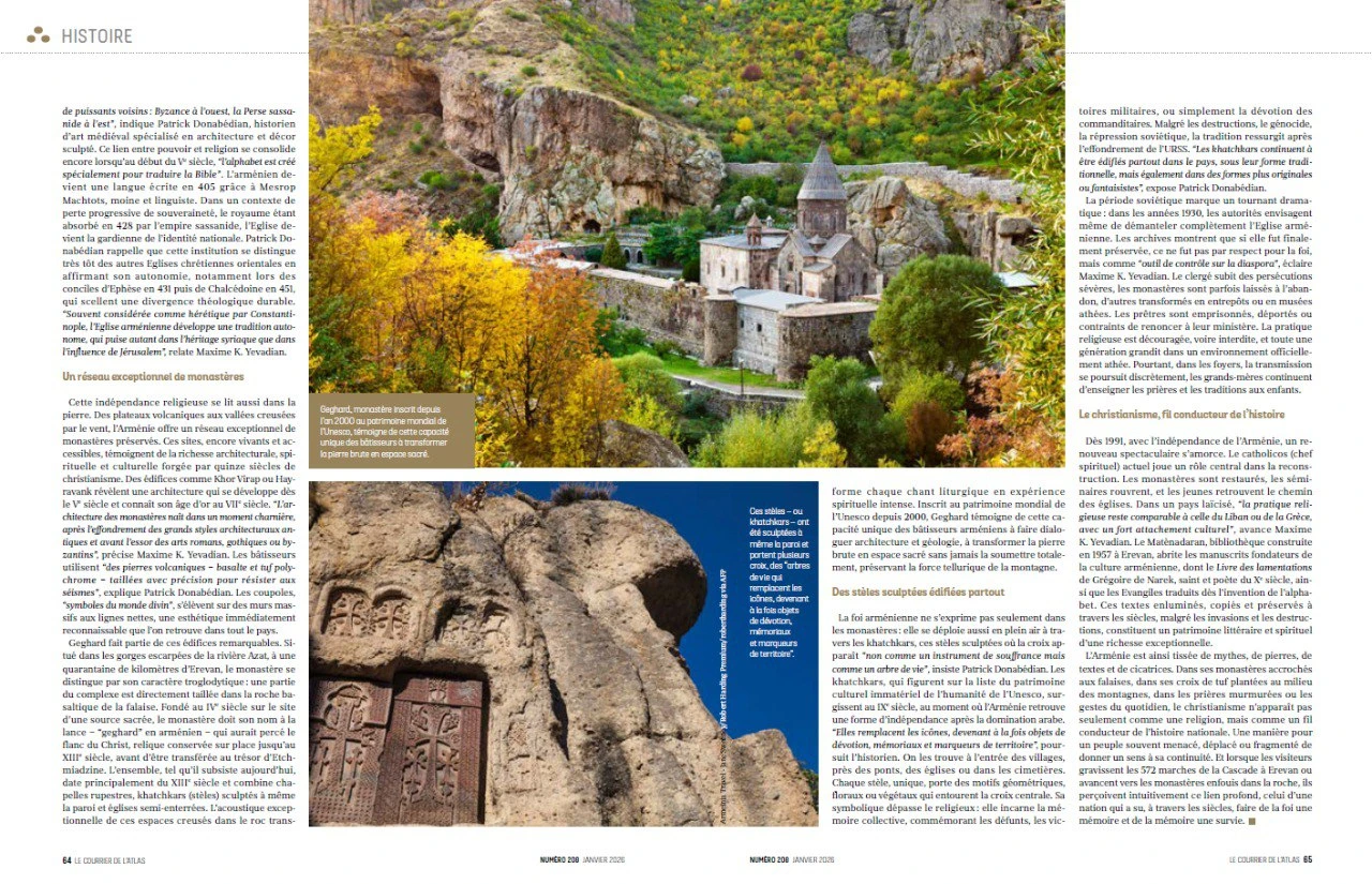 Le Courrier de l’Atlas ամսագրի լրագրող Ֆաթմա Թորխանիի հեղինակած նյութը գեղեցիկ կերպով բացահայտում է Հայաստանի քրիստոնեական էությունը, ընդգծելով դրա պատմական նշանակությունն ու կարևոր դերը երկրի մշակութային և հոգևոր կյանքում մինչ այսօր։