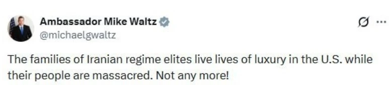 «Իրանի բարձրաստիճան պաշտոնյաների ընտանիքներն ԱՄՆ-ում ապրում են շքեղության մեջ, մինչդեռ նրանց ժողովուրդը ենթարկվում է զանգվածային սպանությունների։ Բայց դա հիմա ավարտվեց»,- գրել է Ուոլցը X սոցիալական ցանցում: