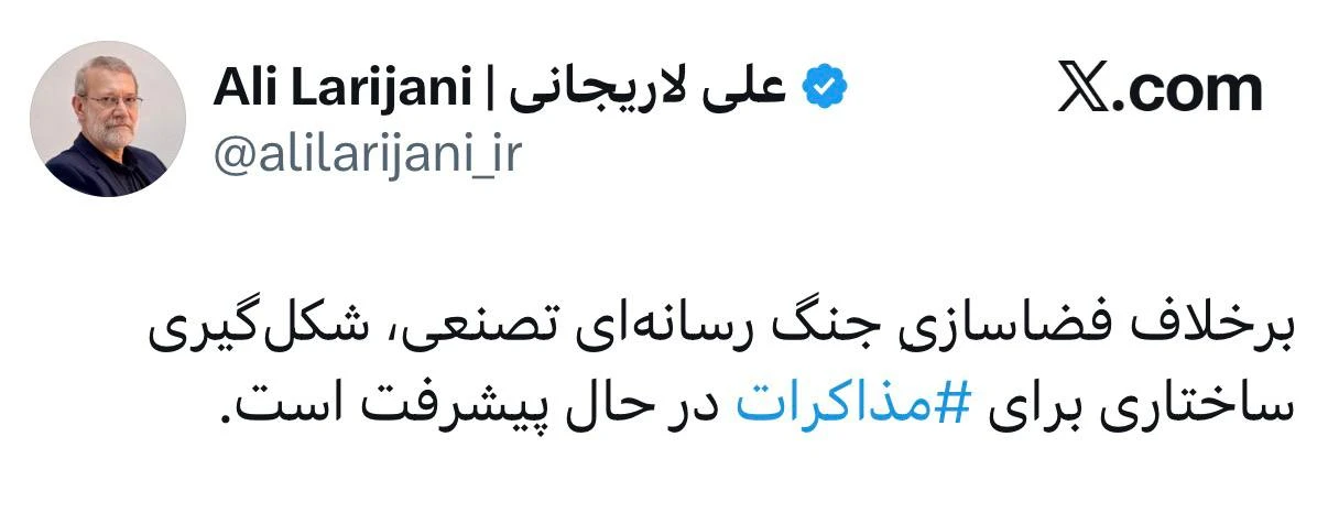 «Չնայած մեդիա պատերազմի արհեստականորեն ստեղծված մթնոլորտին, (ԱՄՆ-ի հետ - խմբ.) բանակցությունների շրջանակի ձևավորումը առաջընթաց է գրանցում», - գրել է Լարիջանին իր սոցցանցերի էջում։